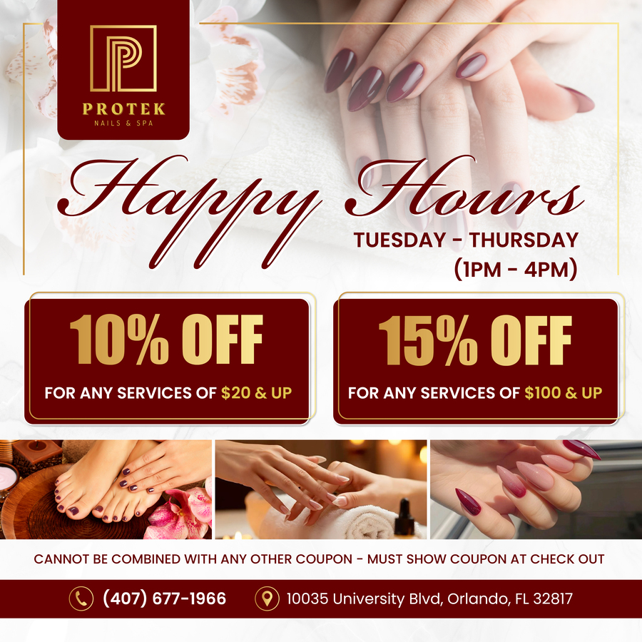 Welcome to Protek Nails. Located at a beautiful place in Orlando, FL 32817. Protek Nails offers the ultimate in pampering and restoring your beauty with our whole-hearted, careful & professional staff. Comprehending customer is not an easy task. It’s even harder when it comes to nail art & caring services.